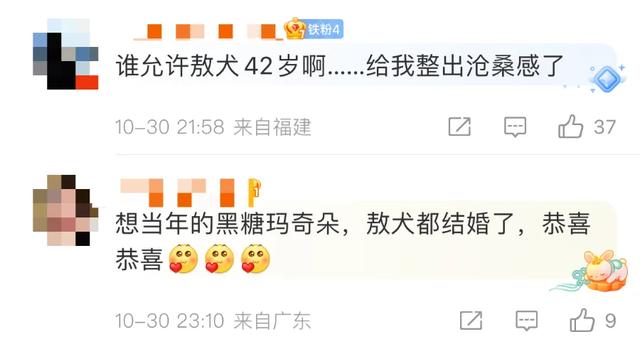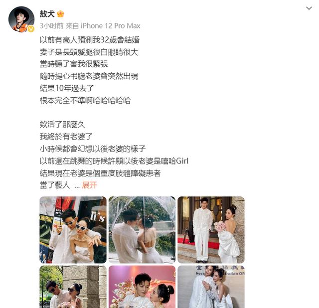 10月31日,中国台湾知名歌手、演员敖犬发文官宣结婚。