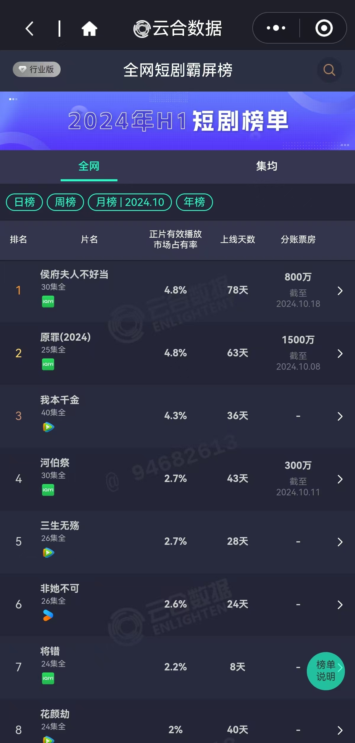 据云合数据,十月短剧全网正片有效播放市场占有率前三名为:《侯府夫人不好当》《原罪(2024)》《我本千金》。