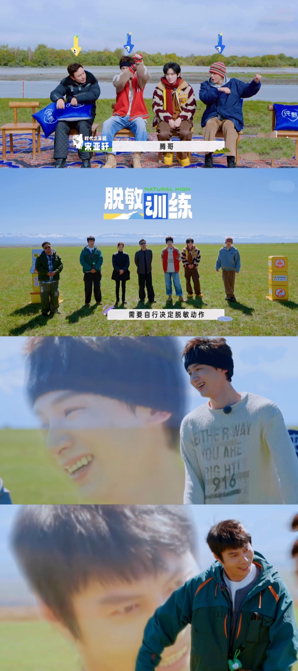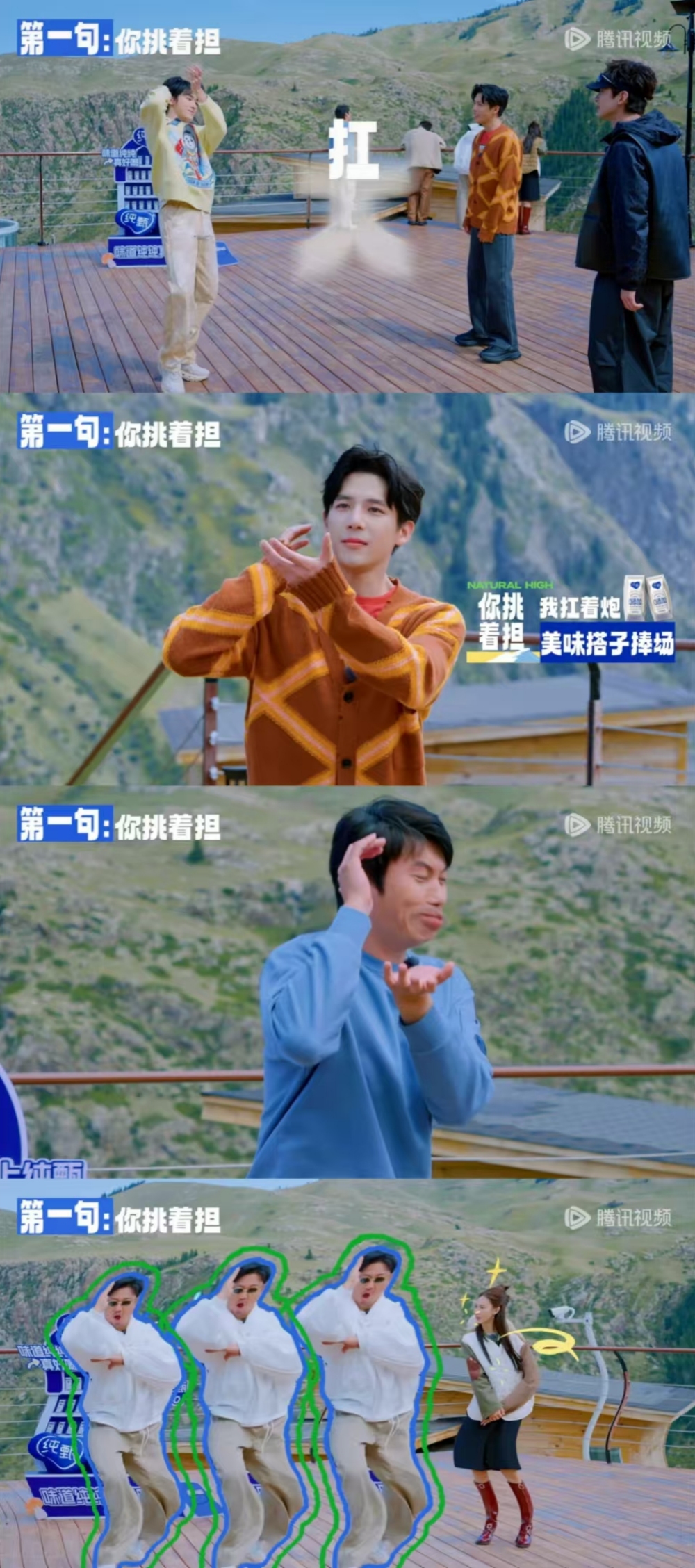这一期的第一声爆笑来自出发之前的旷野默契测试——你比划我猜的“歌词传声筒”游戏中,明显有代际差的嘉宾们对于歌词内容有自己的演绎,“预期违背”的地方在于,最大的bug没有卡在沈腾和贾冰身上,而是在猜《敢问路在何方》时,第二棒的宋亚轩完全没有理解白敬亭比划的歌词,并由此带偏了之后所有人,大家把“你挑着担”全部演绎成“你扛着炮”。
