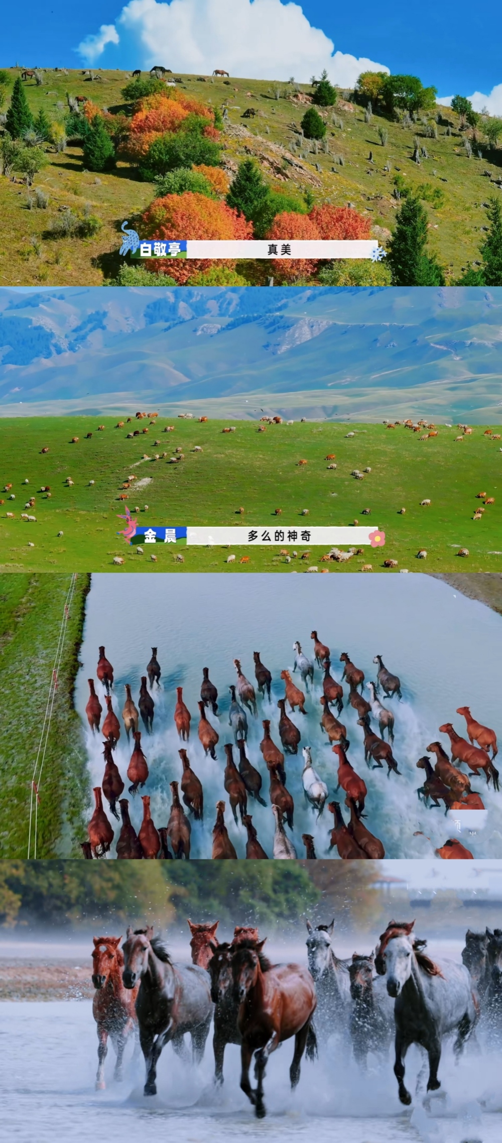 之后大家就正式去到旷野中,雪山、玉湖、草原、湿地、森林……新疆美丽的自然风光在镜头中徐徐展开,最激越的场景是天马浴河,赶马人会赶着一群马驰骋着进入一条清浅的河流中,马儿奋蹄奔腾,河面上激起层层白浪。