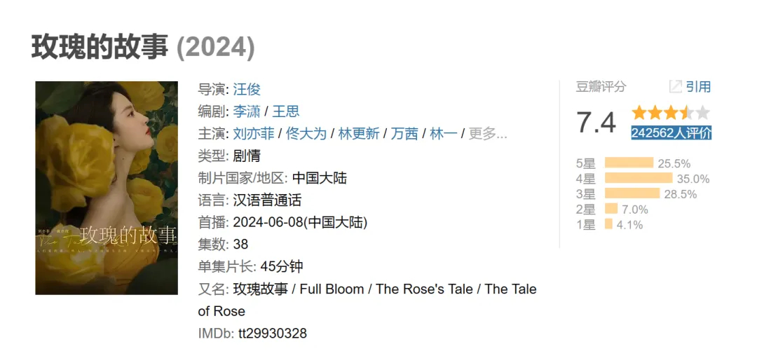 目前,该剧豆瓣评分为7.4分,有超过24万人进行打分。