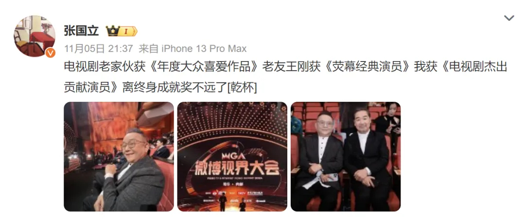 11月5日晚,微博视界大会上,张国立和王刚这对曾经的搭档再次同台,各自凭借在电视剧领域的杰出贡献获得殊荣。演员王刚获得了“电视剧荧幕经典演员奖”,而张国立获得“电视剧杰出贡献演员奖”。