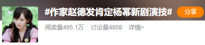 今天,#作家赵德发肯定杨幂新剧演技#冲上微博热搜, 引发众多关注。