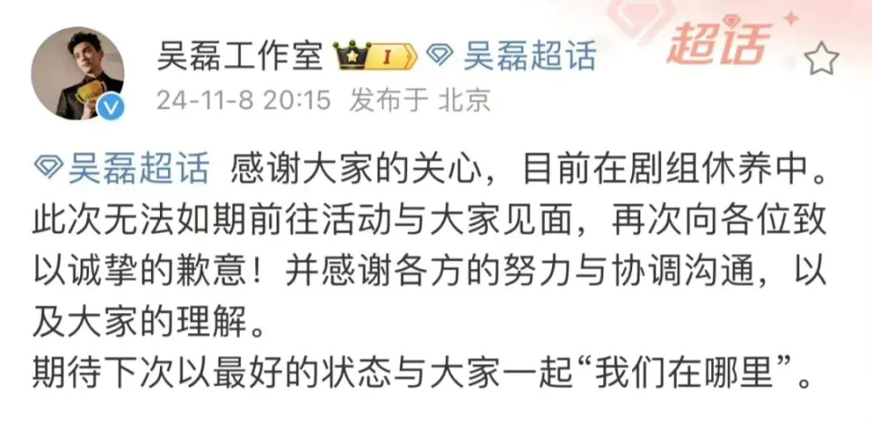 并表示吴磊目前在剧组休养中。