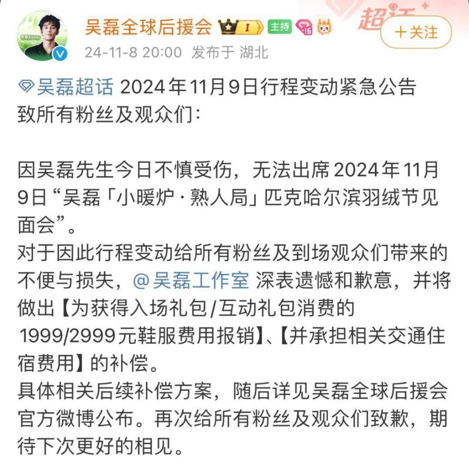 因为吴磊先生今日不慎受伤,