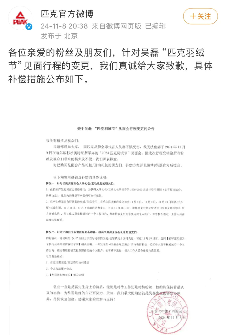 @匹克官方微博发文证实