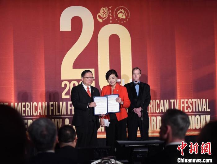 当地时间11月8日,第20届中美电影节、中美电视节在美国洛杉矶举行开幕式暨“金天使奖”颁奖典礼。图为美国联邦众议员赵美心向中美电影节、中美电视节主席苏彦韬(左一)颁发贺状。 中新社 记者 张朔 摄