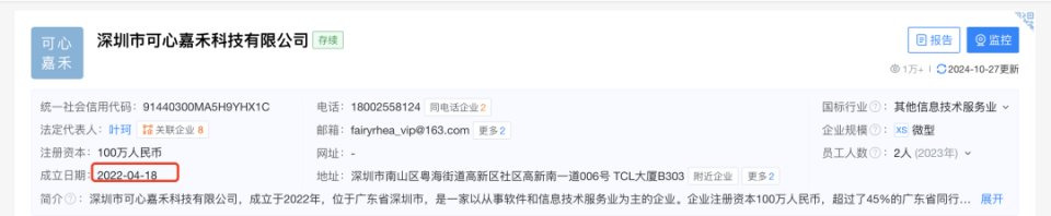 但据天眼查信息显示,深圳市可心嘉禾科技有限公司创立于2022年4月18日,也就是这篇文章发布的一周前。