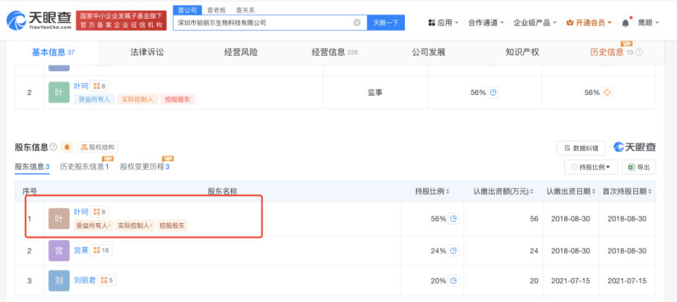 据天眼查APP,叶珂以56%股权控股了深圳市铂丽尔生物科技有限公司,该公司下设一家全资子公司深圳珀玑医疗美容诊所,注册于2019年,经营范围包括医疗美容科、美容皮肤科诊疗服务。