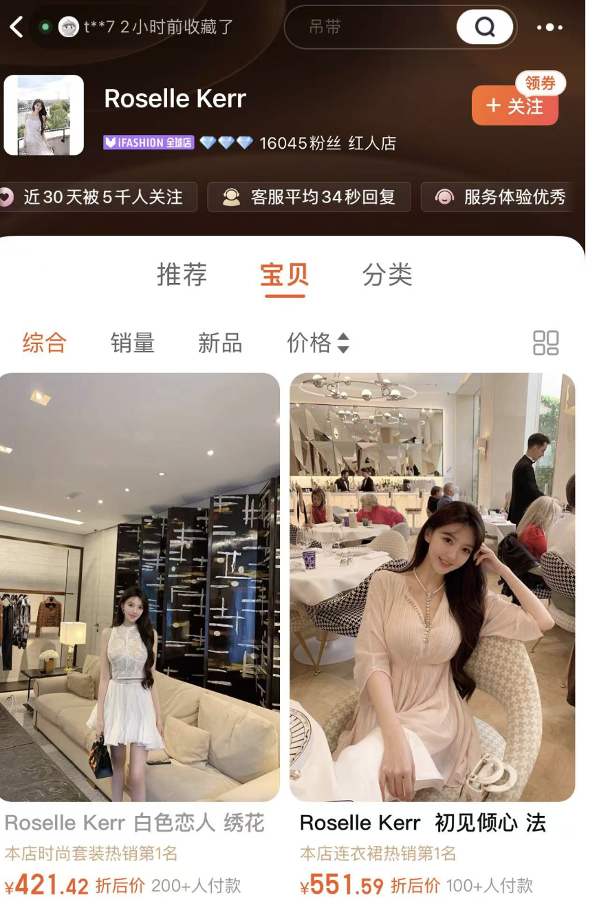 此外,叶珂的淘宝女装店名为“Roselle Kerr”,目前仅有1万多粉丝,商品链接也仅有20多条,年销量在9000件左右。
