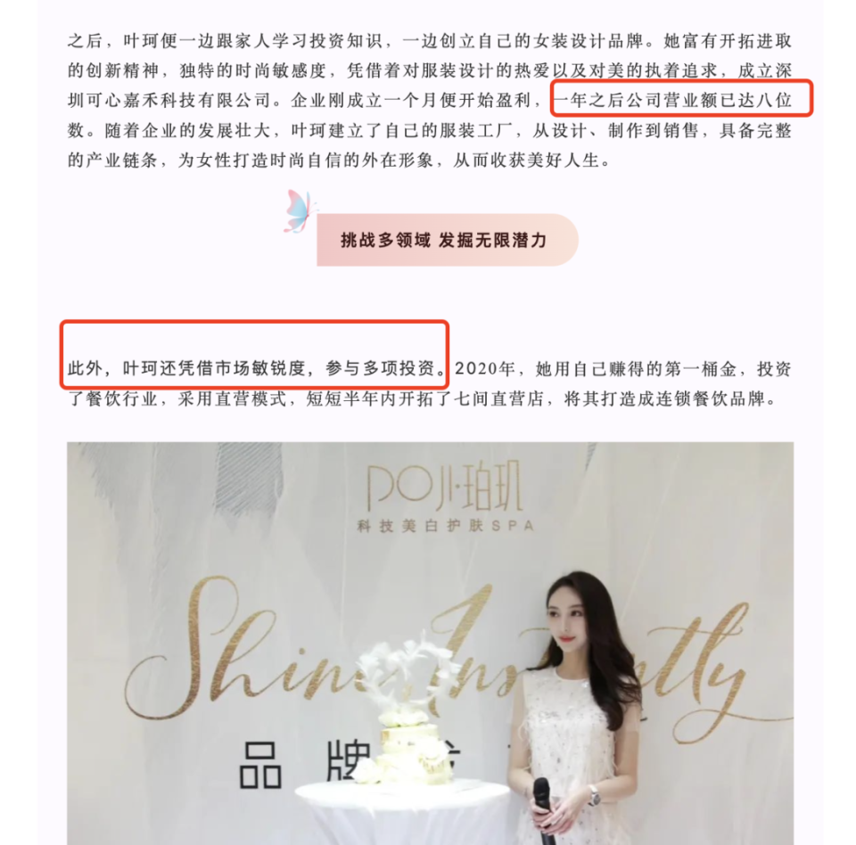 医美领域,文章中称叶珂负责的“铂丽尔生物科技有限公司”是一家高端私人科技美肤SPA馆,占地一千平,是“科技园区最受精英白领喜爱的美容SPA馆”。