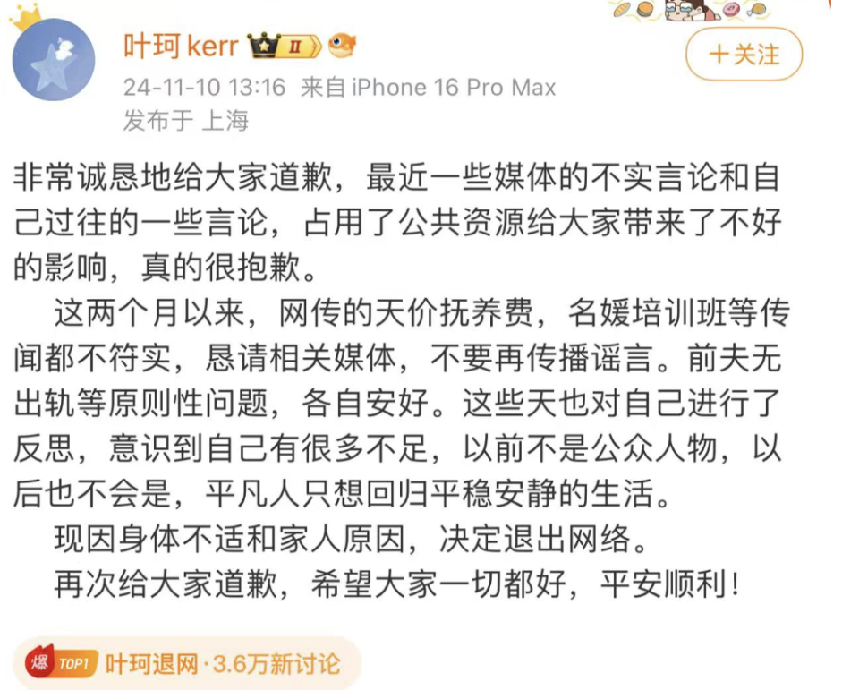 11月10日,叶珂在微博发文回应近期传闻,表示“天价抚养费”“名媛培训班”“前夫出轨”等传闻都不符实,自己以前不是公众人物,以后也不会是,平凡人只想回归平稳安静的生活。
