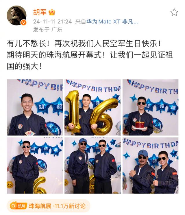 11月11日晚,胡军在社交平台晒照为儿子胡皓康庆祝16岁生日。画面中胡军和康康都是硬汉造型,穿着同款衣服,可以看出康康身高已经和爸爸胡军一样高。