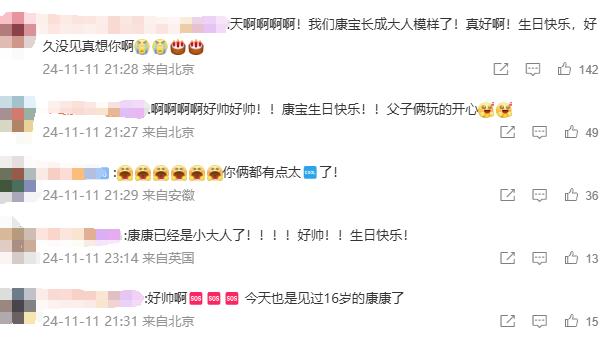 不少网友在评论区感叹,康康已经成长为大帅哥。