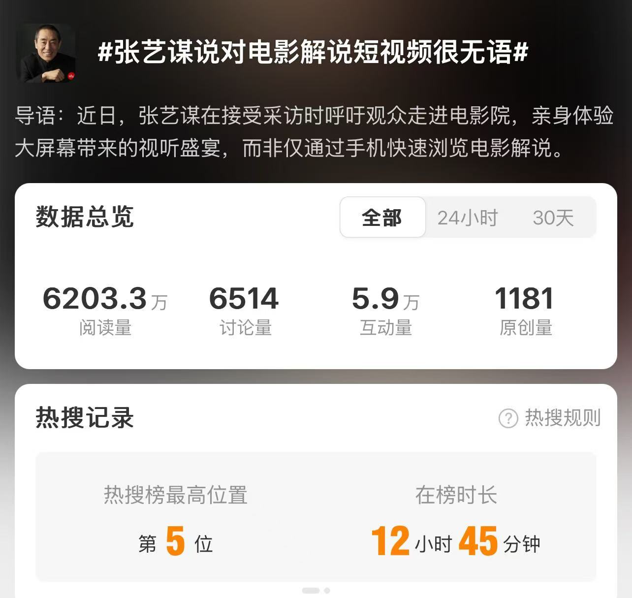 11月12日,“张艺谋说对电影解说短视频很无语”冲上热搜。