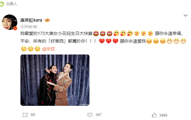 11月13日凌晨,惠英红卡零点为宋佳庆生:“我最爱的173大美女小花儿生日大快乐,愿你永远幸福、平安,所有的「好东西」都属于你!!!愿你永远爱我。”