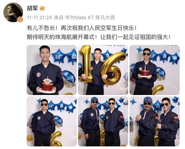 前一天,胡军曾发文祝儿子胡皓康生日快乐,“有儿不愁长!再次祝我们人民空军生日快乐!期待明天的珠海航展开幕式!让我们一起见证祖国的强大!”