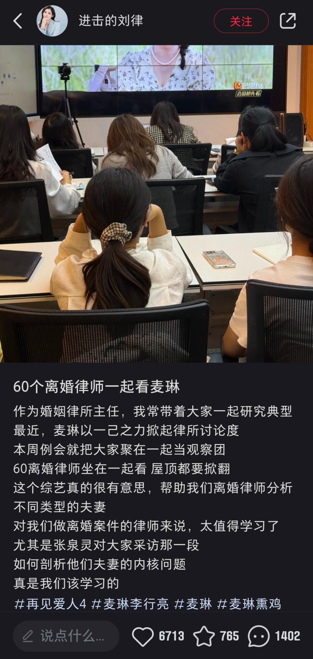 婚姻律师刘琬琳告诉潇湘晨报记者,麦琳的样子像很多来咨询的客户的样子,更能代表普通人的婚姻生活,所以就组织律所同事一起通过综艺来探究麦琳在综艺上的行为背后的深层原因,下周例会继续看《再见爱人》,网友纷纷求律所开直播让律师来当观察员。