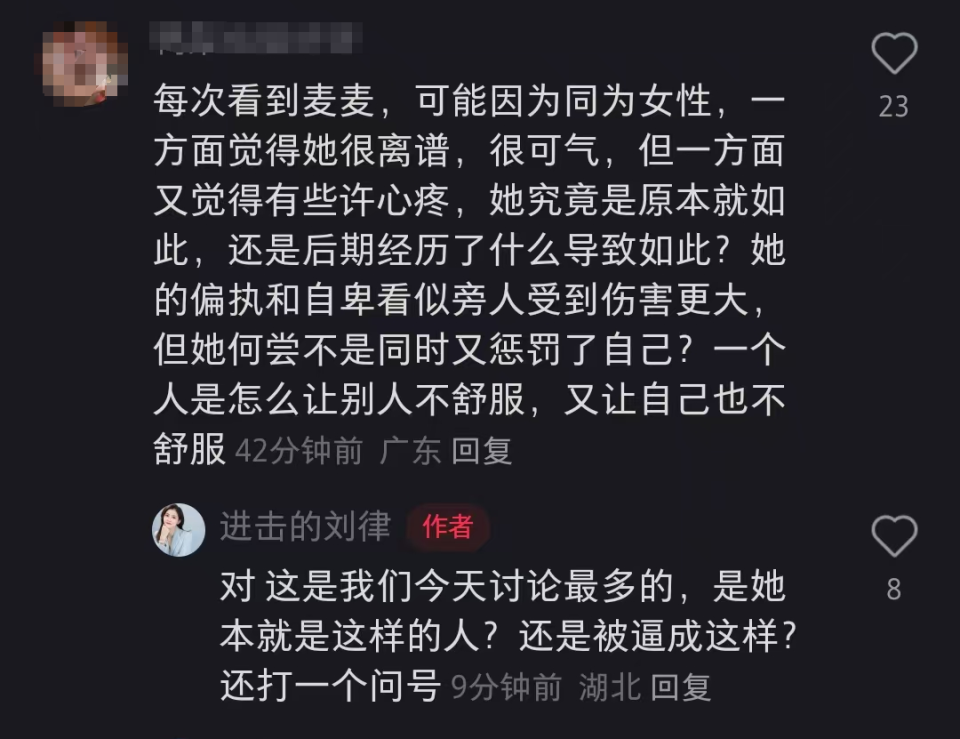 还有网友表示,每次看到麦琳都既生气又心疼,好奇她究竟是本就如此还是因为某些经历才变成这样。刘律师在评论区表示,这个点也是大家探讨最多的一个问题。