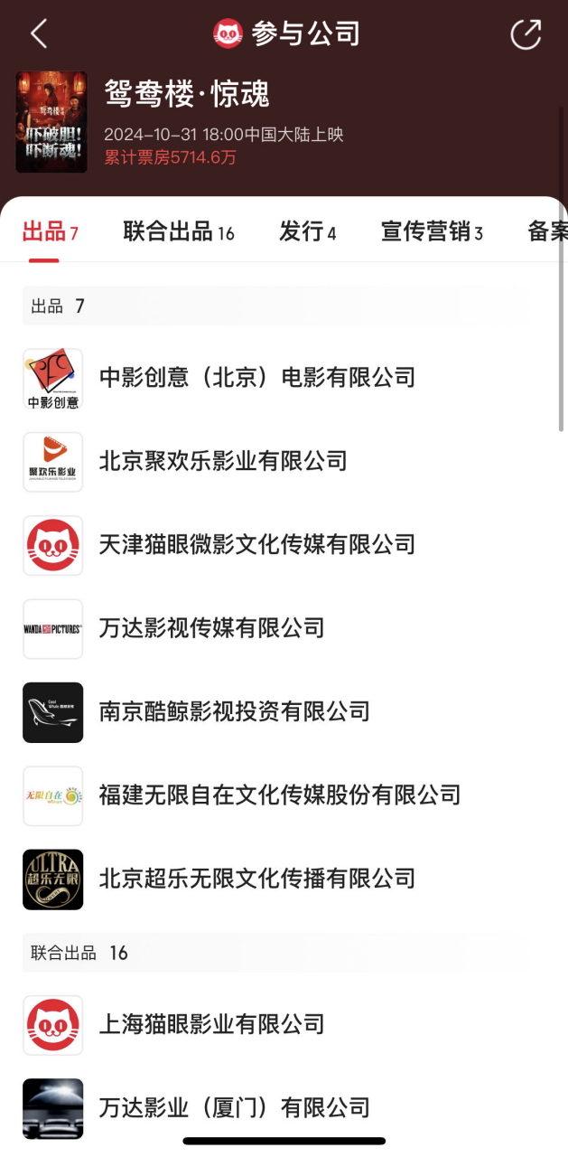 从《鸳鸯楼:惊魂》披露的影片信息来看,成本并不高的它出品方有7家,联合出品则多达16家,其中不乏猫眼、万达、无限自在等主流电影公司。由此也可以看出大牌商业电影公司对这块“蛋糕”的认可。