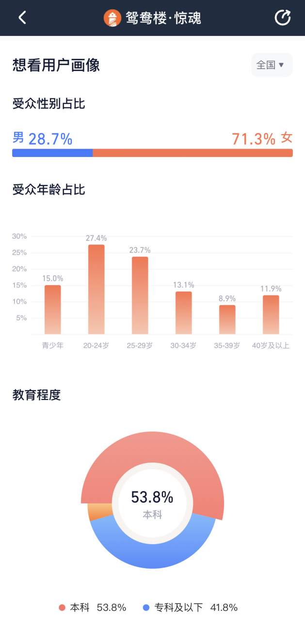 影片在叙事上贴合了近期电影市场上的“女性崛起”风潮,三位女性间“girls help girls”结成的“鬼蜜复仇联盟”和手撕渣男的情节在惊悚体验给足之余,也赋予了观看者更丰富的情绪价值。故事内核非常接近去年暑期档大爆款《消失的她》,因此引爆了女性观众的观影热情。从灯塔专业版提供的用户画像来看,该片观众中,女性占比超过7成,25岁以下占比接近六成。《鸳鸯楼:惊魂》的成功也许提示了一个新的现象,恐怖片受众并没有减少,但已经发生了代际转换,从过往情侣观影为主转变为如今闺蜜结伴观影的场景体验。