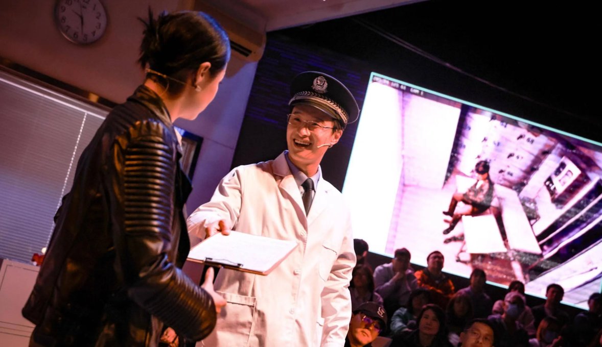 观众席的设计别出心裁。与表演区融为一体,模糊了两者的界限。观众被分成“以鹅传鹅”“吃瓜群众”“上帝视角”三部分,分布在西餐厅、歌舞厅、羊汤馆、派出所、审讯厅、修车铺等各个区域。观众不再只是旁观者,而成为演出的一部分。有的观众可能会更近距离地接触到演员;有的仿佛置身案件发生现场;有的则可以宏观地观察整个剧情的推进和舞台上的各种细节。例如,在派出所区域的观众,常常参与案情研判,还能体会办公室文化;羊汤馆区域的观众,可能会闻到肉味,但胆小的人需要谨慎选择,因为随时会有一些出其不意的情节或互动;西餐厅区域的观众,尤其是男性观众,正对着中心舞台,互动的可能性较高……这些设置都能让观众沉浸感受剧情的紧张刺激、幽默风趣以及人物的喜怒哀乐。