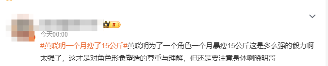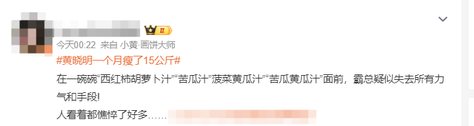 黄晓明工作室公布的黄晓明减肥经历中,他不得不在短时间内喝下一碗碗“西红柿胡萝卜汁”“苦瓜汁”“菠菜黄瓜汁”“苦瓜黄瓜汁”,最终,体重减至130斤以内。