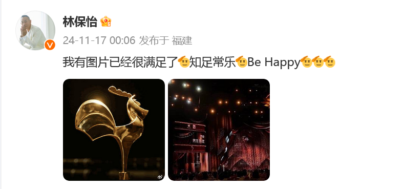 11月17日,林保怡连续发文回应。凌晨,林保怡晒金鸡颁奖礼现场图回应:“我有图片已经很满足了,知足常乐,Be Happy。”