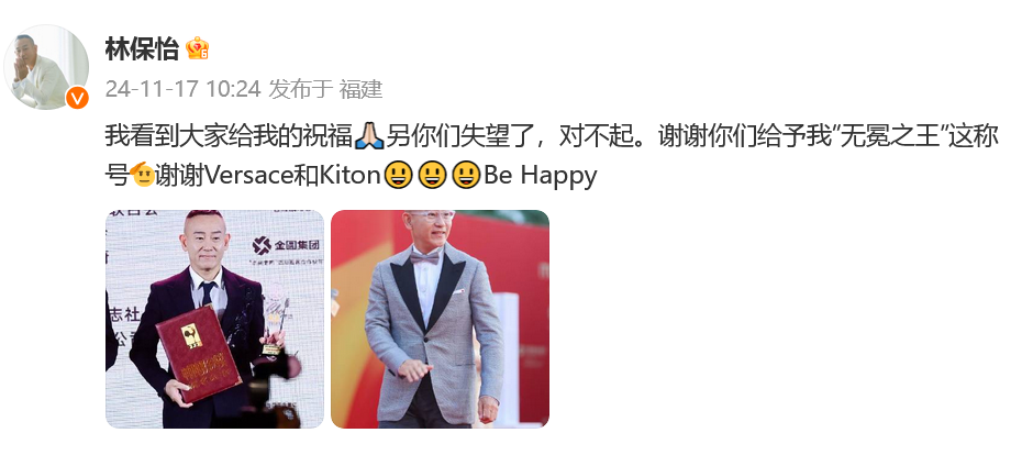 17日上午,林保怡晒出举着提名证书的照片再回应:“我看到大家给我的祝福,令你们失望了,对不起。谢谢你们给予我‘无冕之王’这称号。谢谢Versace和Kiton,Be Happy。”