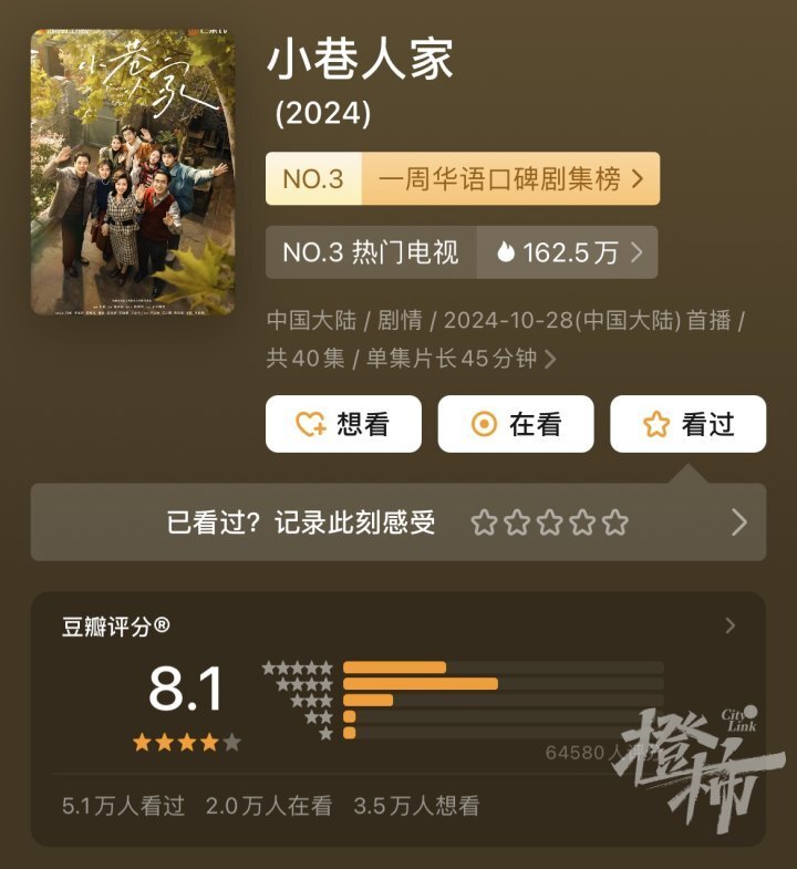 与同期播出的《永夜星河》《珠帘玉幕》《大梦归离》三部古装偶像剧相比,《小巷人家》没有苦大仇深的剧情,也没有炫目的特效,只凭着一个又一个普通却温润的邻里故事,引起了无数观众的共鸣,在豆瓣上拿到了8.1的高分。