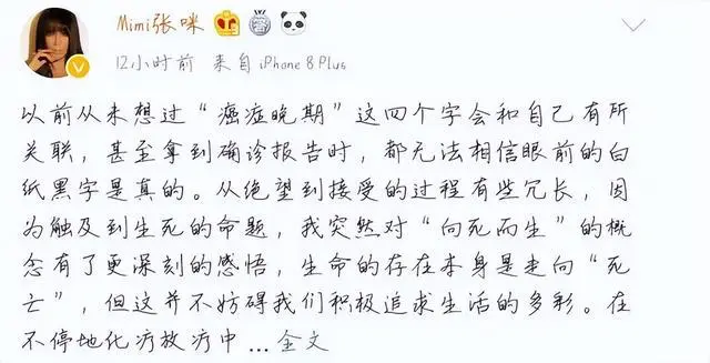 此前,张咪发文称2019年4月12日被确诊为扁桃体癌和口腔癌晚期。当时情况就很危急,扩散的也比较严重,家里人都收到了病危通知,但庆幸她挺了过来,付出了大量的金钱和精力。