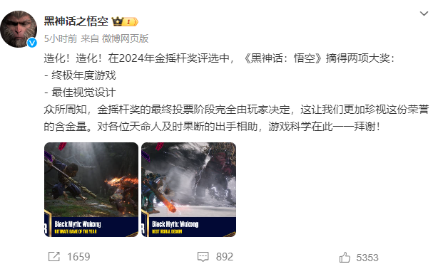 众所周知,金摇杆奖的最终投票阶段完全由玩家决定,这让我们更加珍视这份荣誉的含金量。对各位天命人及时果断的出手相助,游戏科学在此一一拜谢!