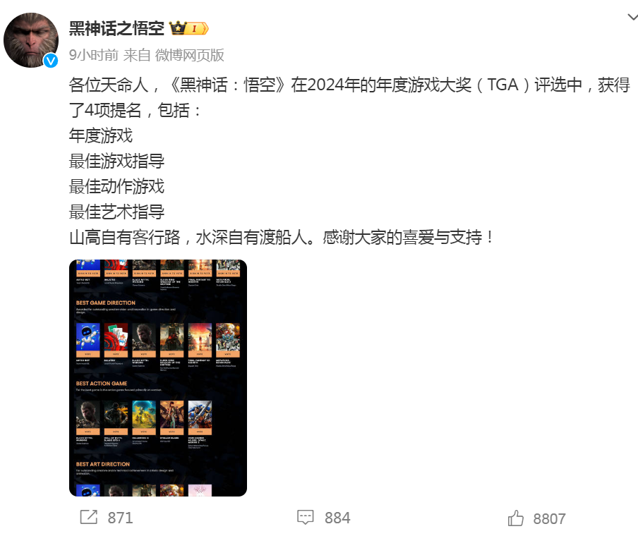 就在11月19日,2024年度游戏大奖(TGA)通过官方微博公布了各类奖项的提名名单。《黑神话:悟空》获得年度游戏、最佳游戏指导、最佳动作游戏以及最佳艺术指导等4项提名。