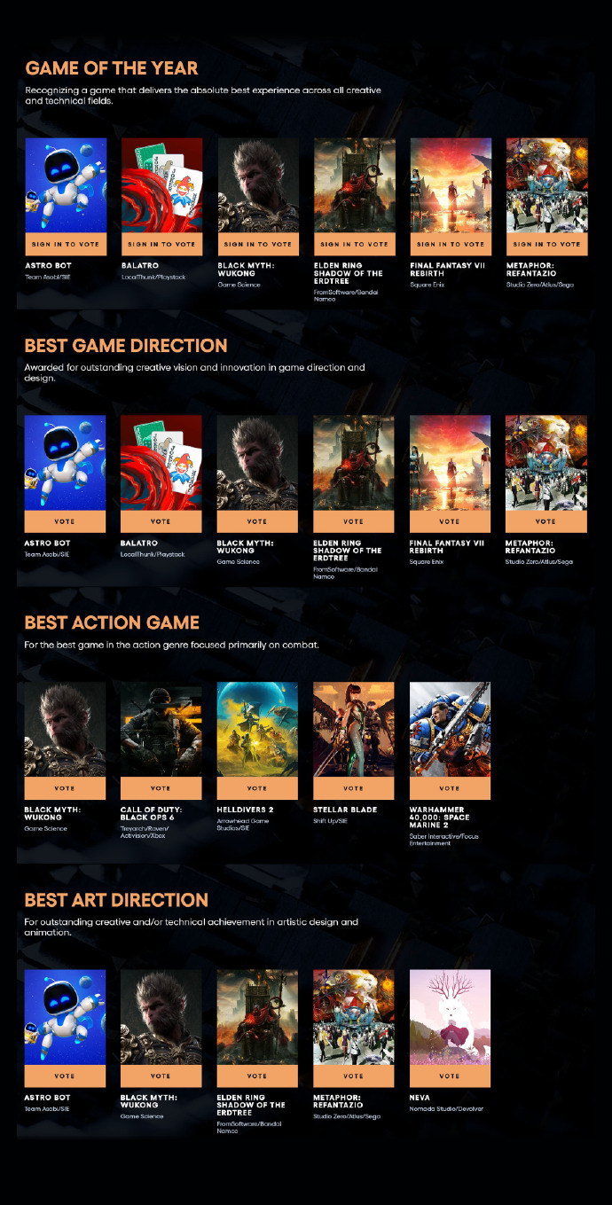 各位天命人,《黑神话:悟空》在2024年的年度游戏大奖(TGA)评选中,获得了4项提名,包括: