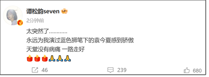 刚刚,演员谭松韵发文悼念:太突然了......永远为我演过蓝色狮笔下的袁今夏感到骄傲,天堂没有病痛,一路走好。