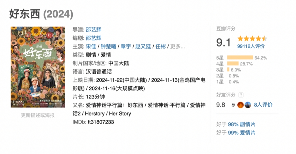 11月22日,电影《好东西》正式全国公映。在此之前,凭借几轮点映,《好东西》的口碑一路保持高位。豆瓣惊喜开分9.1后,影片于本周开启大规模点映,打分人数从5万上涨到近10万,分数依然未受影响。