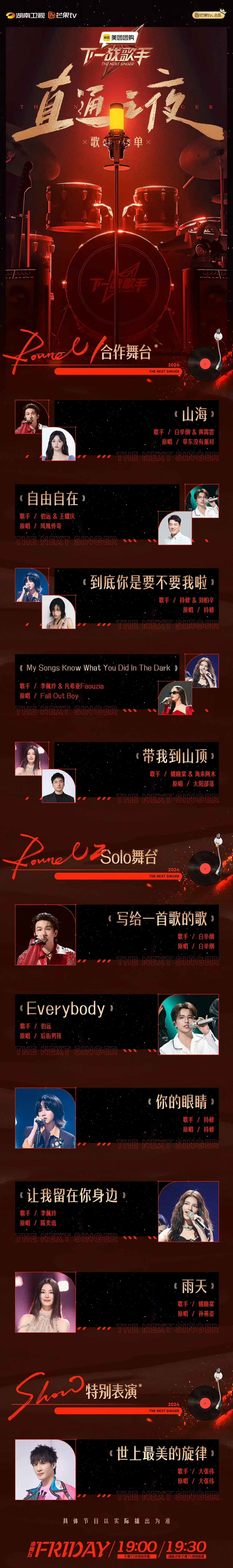 在此前的节目中,白举纲对不少歌曲融入了自己的独特改编,给观众带来了耳目一新的全新感受。今晚他将用一首《写给一首歌的歌》,唱出自己对生活的独特感悟。在节目中带来了《MAMA》《CountingStars》等唱跳节目的伯远,这次则将挑战后街男孩的《Everybody》,带领大家一同重温经典。持修将首唱新歌《你的眼睛》,诠释先爱自己才会有人爱你的主旨。