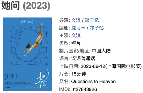 她说她要探索自己的极限,除了作品和角色方面,去年入围上影节的《她问》是她的导演处女作。她借用屈原的《天问》提出女孩对原生家庭与成长经历的痛苦问题。