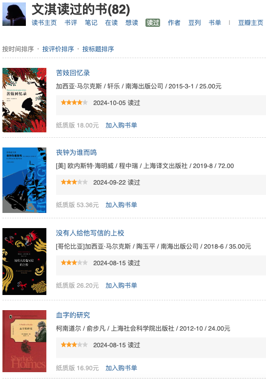 在她的豆瓣主页上,可以窥探到她2024年的读书痕迹:柯南·道尔的福尔摩斯系列,海明威的经典长篇《太阳照样升起》《丧钟为谁而鸣》,马尔克斯的《苦妓回忆录》《爱情和其他魔鬼》,以及一战相关的《西线无战事》、二战相关的《昨日的世界》;观影方面,她又相对偏爱情欲、战争、悬疑、科幻等门类。