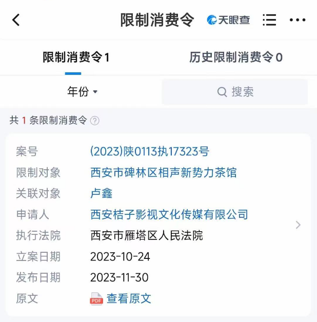 据企查查,西安卢鑫玉浩文化传媒有限公司法人卢鑫已被限制高消费,限高令申请人为西安桔子影视文化传媒有限公司。