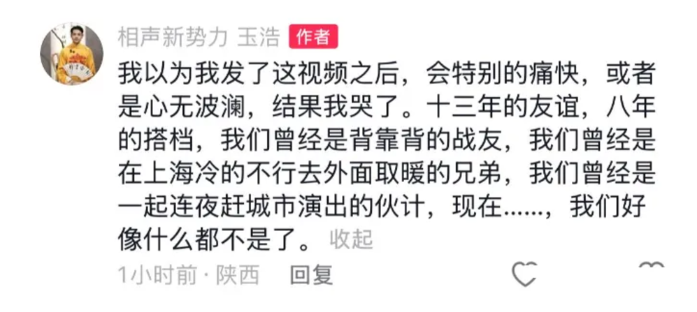 在视频评论区,张玉浩还写到:我以为我发了这视频之后,会特别的痛快,或者是心无波澜,结果我哭了。十三年的友谊,八年的搭档,我们曾经是背靠背的战友,我们曾经是在上海冷得不行去外面取暖的兄弟,我们曾经是一起连夜赶城市演出的伙计,现在......,我们好像什么都不是了。