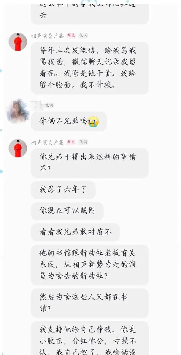 卢鑫在粉丝群中回复网友对两人现在关系的询问,卢鑫称,对方每年3次发信息骂自己父亲,自己已经忍了6年。
