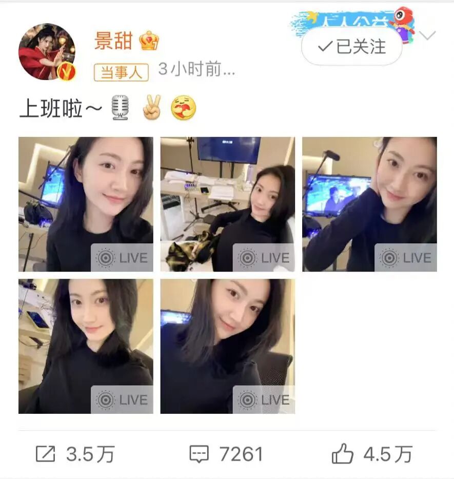 月初景甜曾发文,自己刚动完腿部手术,正在努力做康复训练。今天景甜发微博:“上班啦~”并晒出了最新自拍。