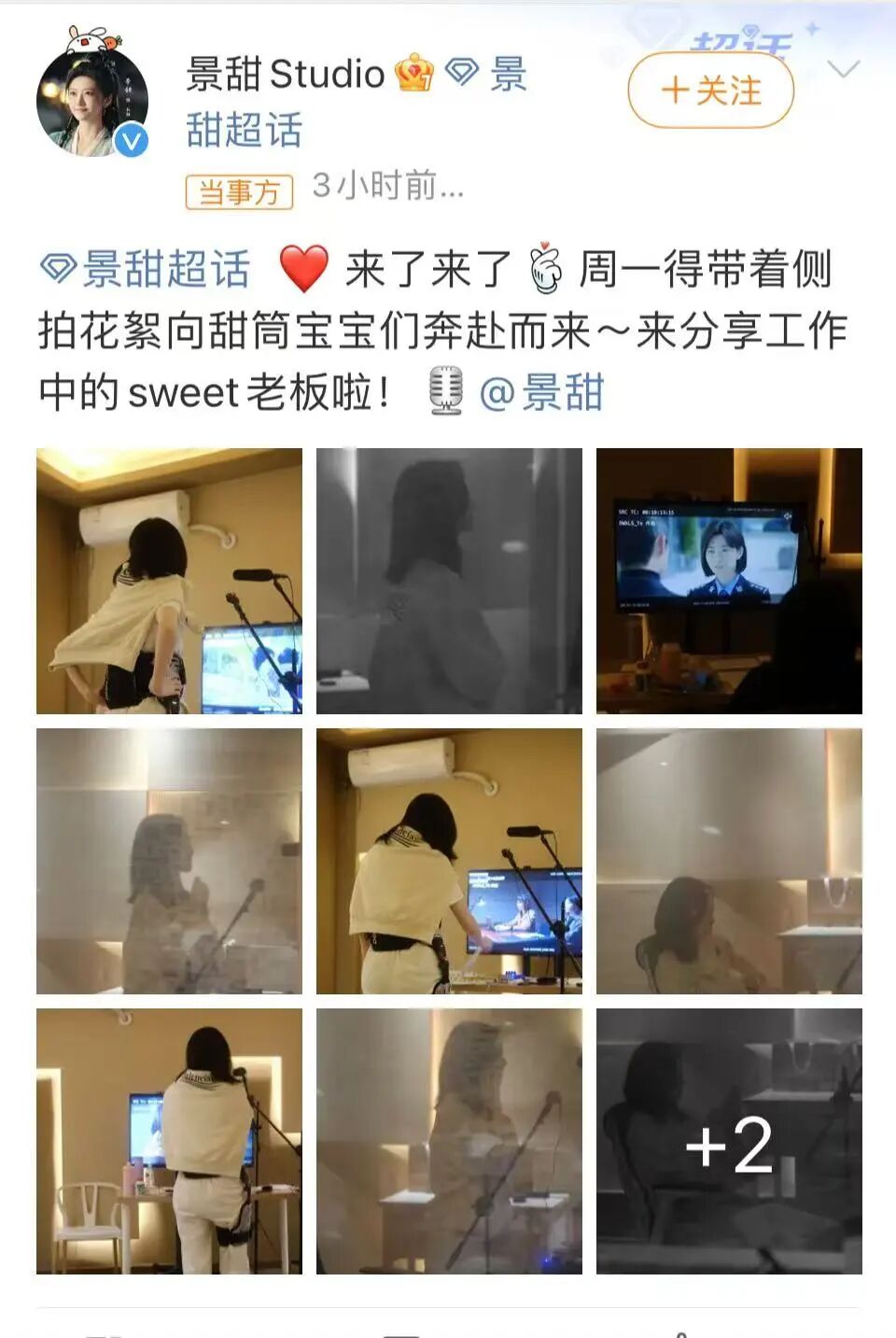 在工作室晒出的花絮照中,能看到景甜在为新剧配音,腿上还戴着护具。