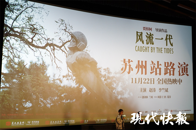 现代快报讯(记者郑文静李艺蘅文/摄)由贾樟柯执导,赵涛主演的时代爱情片《风流一代》正在热映,11月24日,导演贾樟柯空降苏州与观众和影迷们交流互动。作家、导演、赛车手韩寒也惊喜现身,为《风流一代》打call,称影片是一部“有力量、穿越时代的电影”,并在现场呼吁观众一定要去电影院观看《风流一代》。