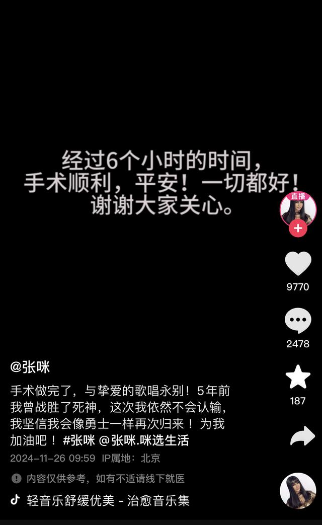 张咪配文道:“手术做完了,与挚爱的歌唱永别!5年前我曾战胜了死神,这次我依然不会认输我坚信我会像勇士一样再次归来!为我加油吧!”
