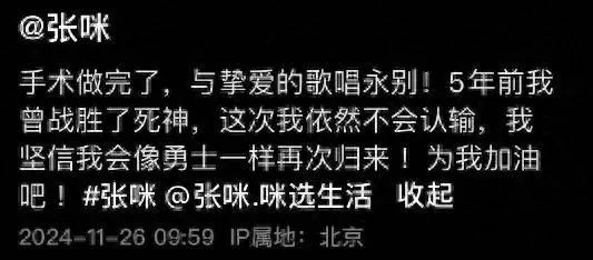 “手术做完了,与挚爱的歌唱永别!5年前我曾战胜了死神,这次我依然不会认输,我坚信我会像勇士一样再次归来!为我加油吧!”