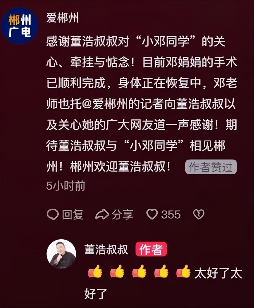 董浩叔叔也发了视频表达对“小邓同学”的关心,郴州电视台在评论区回复,邓娟娟的手术已经顺利完成,身体正在恢复中,期待之后在郴州相见。