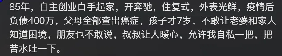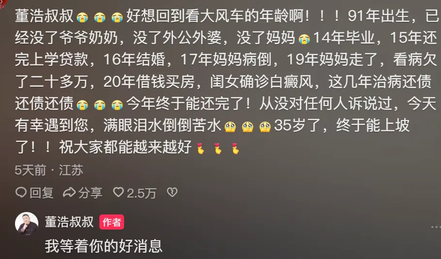 董浩叔叔的视频下面,有很多人留言,大家都在向董浩叔叔倾诉自己的烦恼。很多网友说:“长大一点也不好玩。”“长大太累了。”“我坚持不住了..."
