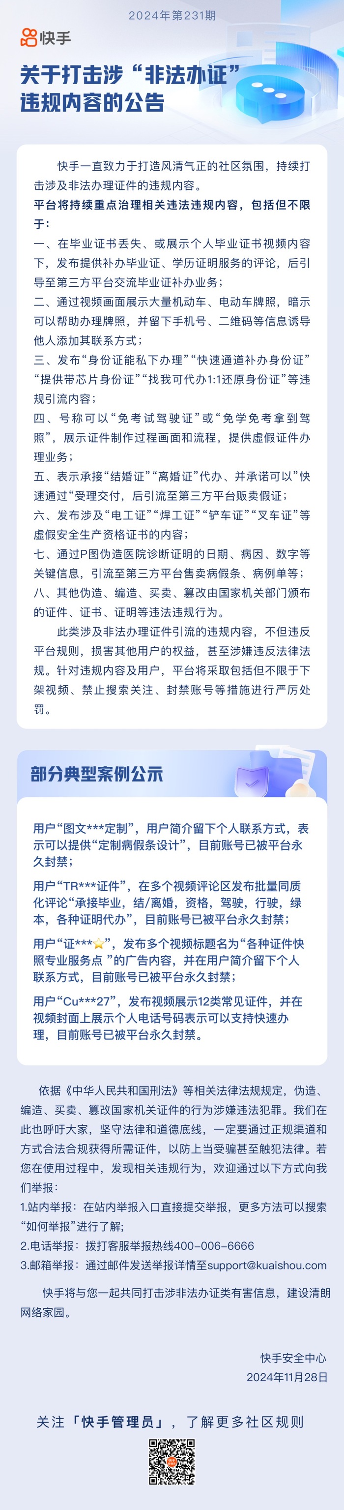11月28日,快手发布关于打击涉“非法办证”违规内容的公告。